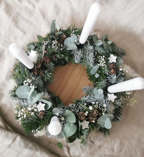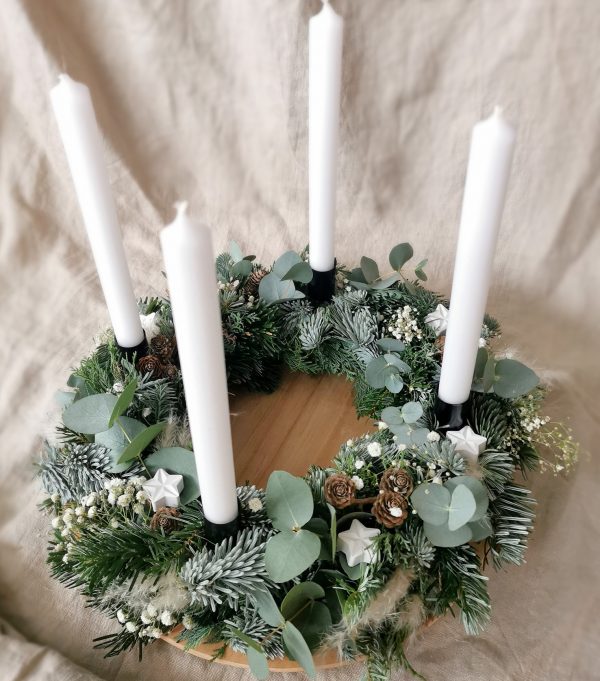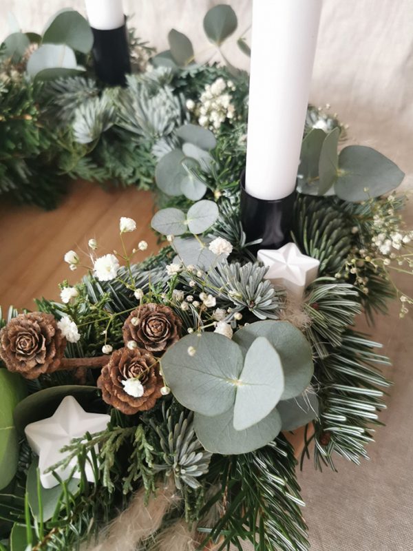 Der 1. Advent naht schneller, als man denkt! Stimme dich bei Weihnachtsmusik, Keksen und Tee, auf die wundervolle Vorweihnachtszeit ein und nimm dir eine festlich kreative Auszeit um dir deinen eigenen, ganz individuellen Adventskranz im Skandi-Stil zu gestalten. Inklusive 4 Kerzen und Kerzenhalterungen!