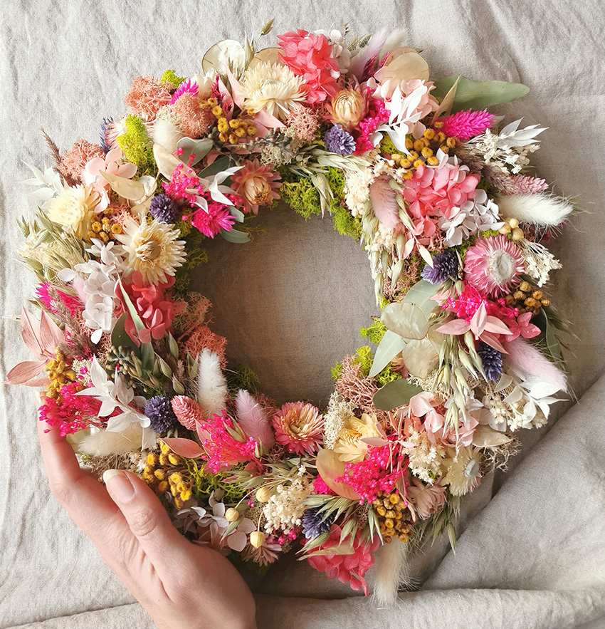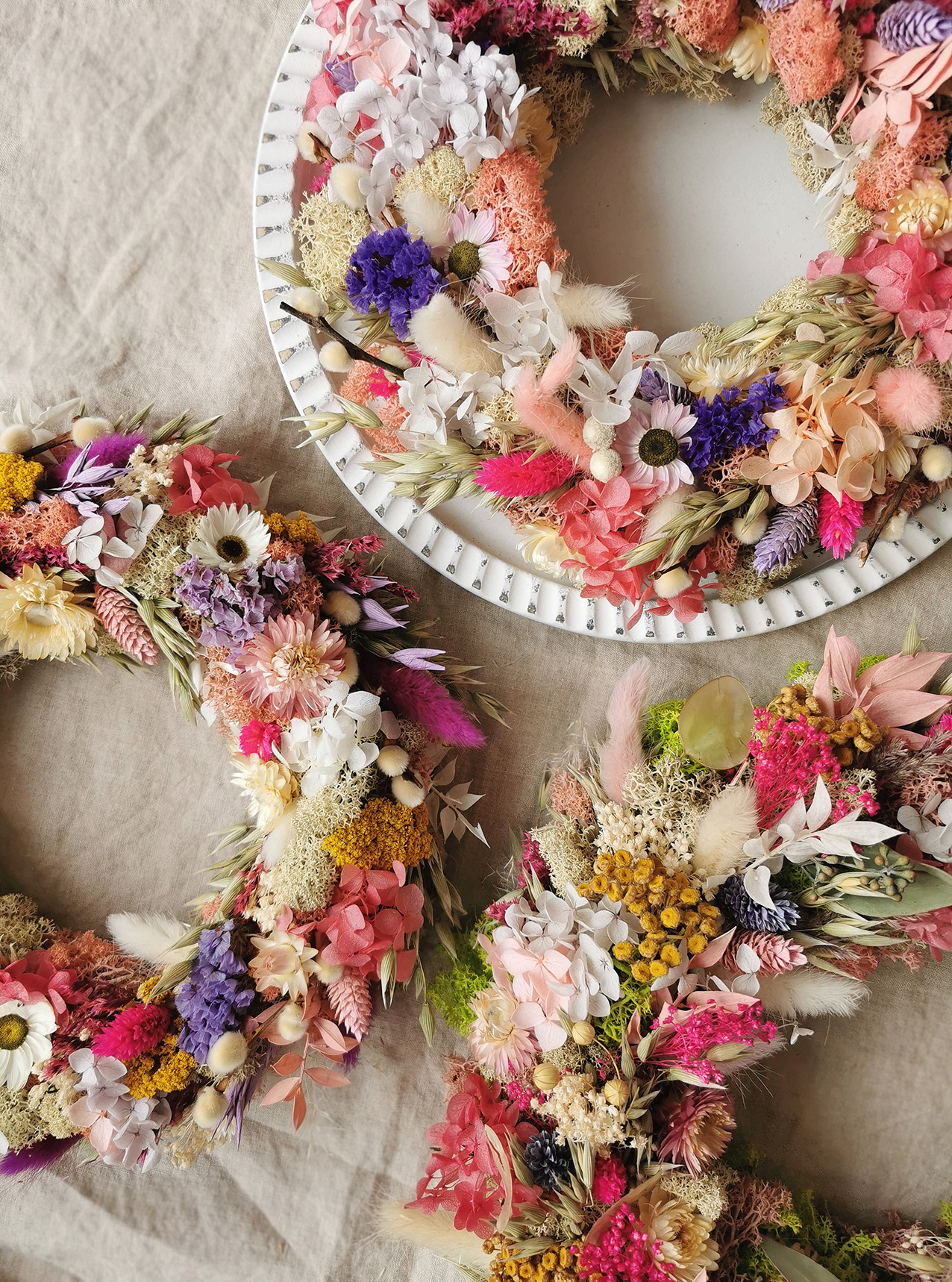 In diesem Workshop wirst du unter meiner Anleitung deinen ganz individuellen Moos-Blumenkranz aus Materialien wie Islandmoos, Phalaris, Ruskus, Strohblumen und vielen mehr anfertigen. Eine tolle Blumenauswahl und Tipps & Tricks rund ums Gestalten deines KRANZ-MUST-HAVE.